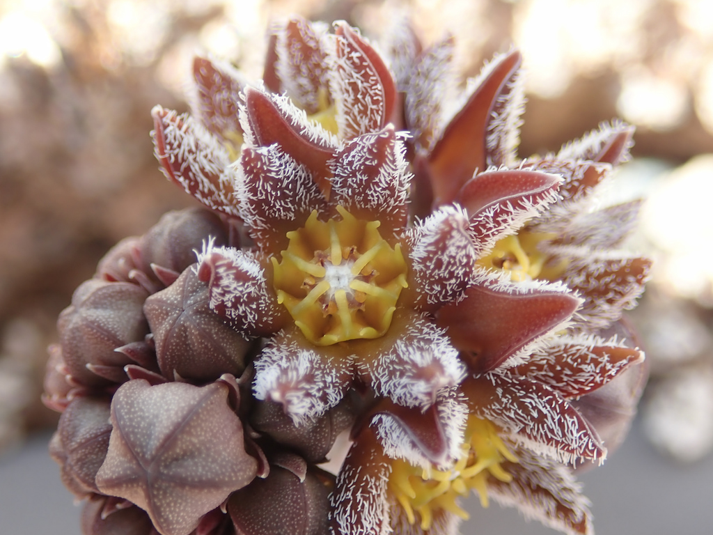 Planta suculenta, perenne, ramificada por estolones subterráneos. Tallos ascendentes o erectos, segmentados, carnosos, glabros, glaucos, de sección cuadrangular y unos 25 mm de diámetro, que pueden alcanzar 35 cm de altura, con pequeños dientes marginales dirigidos hacia abajo. Hojas rudimentarias. Flores apenas pediceladas, de apariencia estrellada, en grupos de hasta unas 17 en la parte subterminal de los tallos. Corola con tubo corto y 5 lóbulos de color marrón-rojizo o marrón-purpúreo, con el borde de los lóbulo más o menos cubierto con cilios blancos. Fruto en bifolículo, fusiformes, glabros, opuestos, con manchas de color púrpura irregulares, de unos 10 cm de largo, con pedicelo de unos 5 mm de longitud. Semillas obovado-oblongas, de 6,5-7,5 x 4 mm, ligeramente naviculares, glabras, con margen membranoso. Cuerpo de la semilla de color marrón y margen de color ocre anaranjado, con superficie reticulada. Corona de pelos sedosos.