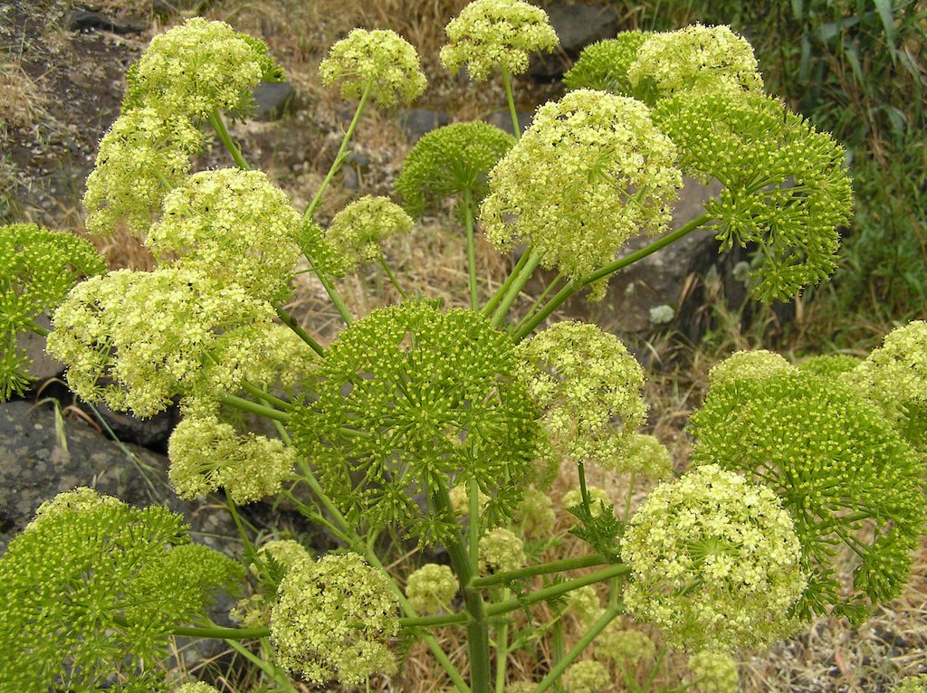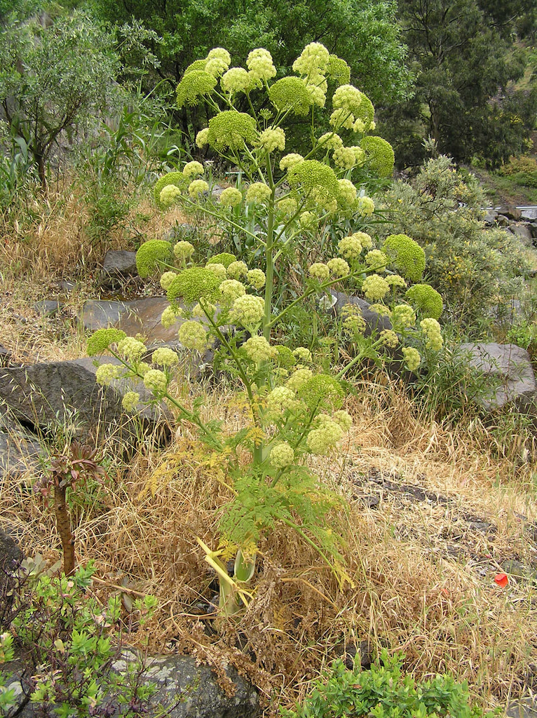 Hierba perenne, de hasta 2 m de altura, cubierta por un denso y suave indumento. Hojas de 30-50 cm de largo, 4(5) pinnadas, con pequeños segmentos lanceolados a lineares, pubescente-tomentosas, de color verde glauco; peciolo ancho en su base, de tonalidad verde o rojiza, que envaina parcialmente el tallo. Inflorescencia en umbela compuesta, semiesférica, de 10-12 cm de diámetro, con brácteas y bractéolas y flores de color blanco amarillento; tallo florífero de 1-2 m de altura. Sépalos diminutos, triangular subulados. Mericarpos de unos 7 mm, con forma estrechamente ovada, con costillas y casi glabros.