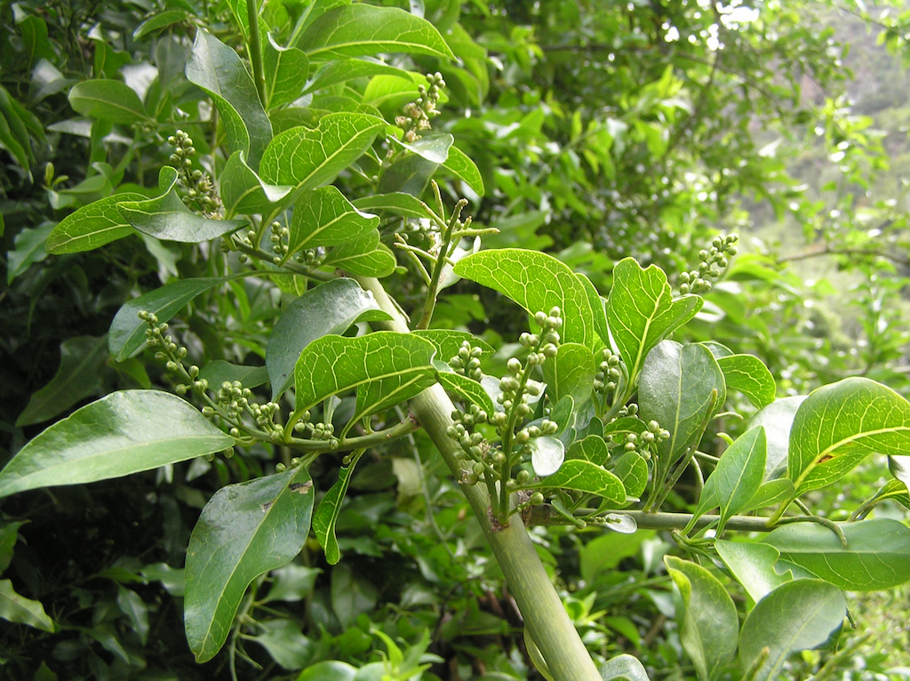Planta arbustiva dioica que puede superar los 3 m de altura, muy ramificada. Ramas leñosas, verdes, glabras, gráciles, largas, casi siempre arqueadas o colgantes. Hojas simples, persistentes de hasta 8 x 4 cm (pecíolo excluido), alternas, pecioladas, de ovadas a ovado-lanceoladas o elípticas, agudas o acuminadas, con márgenes enteros, base atenuada u obtusa, en ocasiones algo asimétrica en la base, glabras, de color verde, casi negras en la desecación, desprendiendo un fuerte olor al romperse. Flores unisexuales, bracteoladas, cortamente pediceladas, numerosas, dispuestas en racimos solitarios o en panículas axilares o terminales; bractéolas escariosas, emplazadas en la base del pedicelo. Flores masculinas con un ovario rudimentario, ovado-piramidal y 5 estambres con el filamento ensanchado en la base, las femeninas con 5 estaminoides y ovario ovoide con un único óvulo. Periantio con 5 tépalos verdosos, glabros, libres, ovados, con el margen escarioso. Fruto carnoso, de c. 5 mm de diámetro, de color fucsia en la madurez, lustroso, subgloboso, deprimido, con una sola semilla.