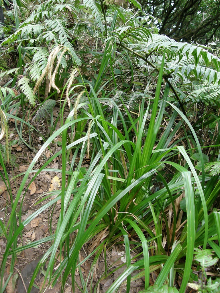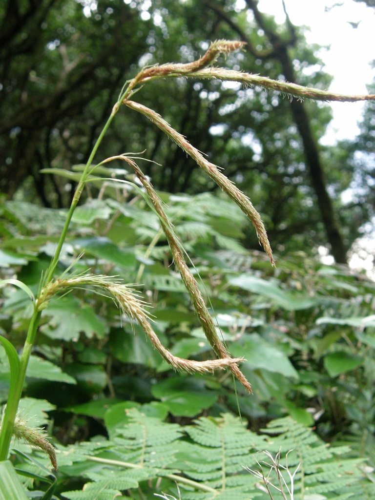 Planta herbácea perenne, con rizoma corto, que puede superar el metro de altura. Hojas reunidas en una roseta basal, planas, verdes, lustrosas, de 1-1,2 cm de ancho, de color rojizo oscuro en la base, con dos nervios prominentes por el haz. Tallos florales triangulares, con espigillas largas, péndulas, de hasta 10-12 cm de largo, unisexuales o mixtas, las 3 a 5 apicales masculinas y el resto femeninas (ocasionalmente mixtas con flores masculinas hacia el ápice de la espigilla y femeninas en la base). Brácteas de las flores papiráceas. Utrículos algo inflados, con breve pico.