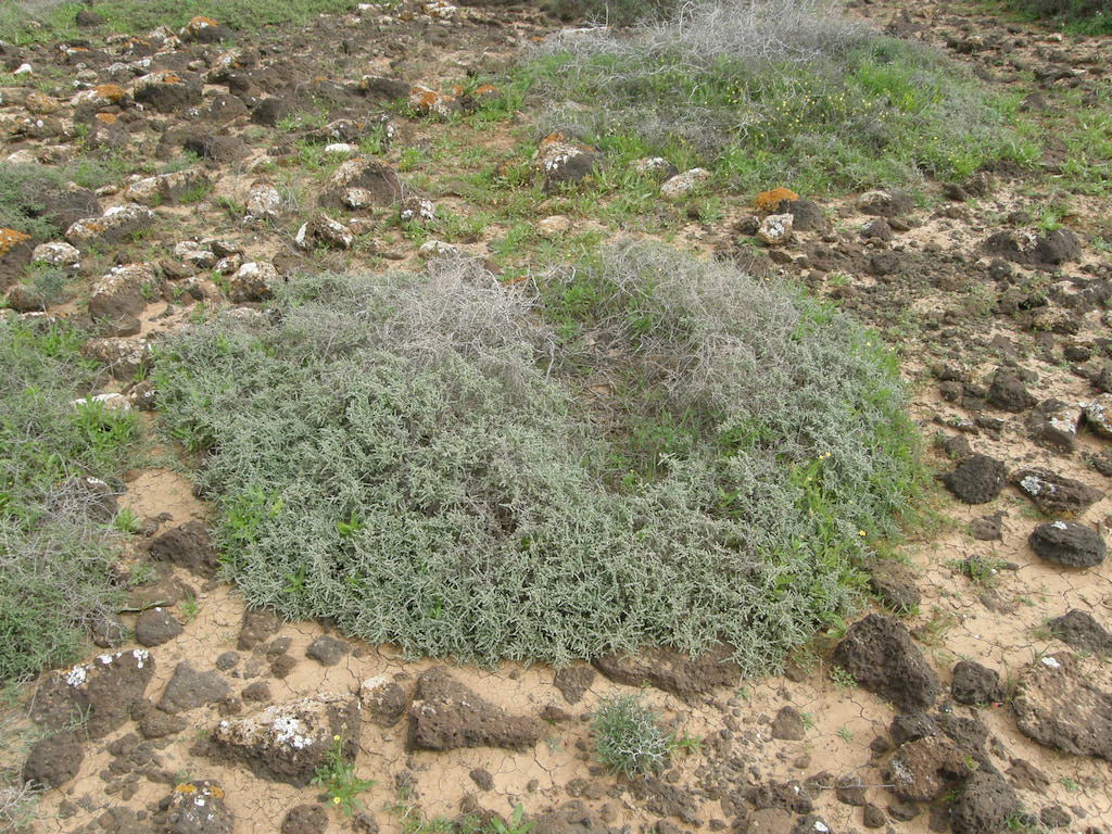 Arbusto de hasta 80 cm de alto, con ramificación intrincada. Tallos recubiertos de un indumento de pelos de tipo uniseriado. Hojas opuestas, sésiles, en forma de escama, con margen hialino casi hasta la base, tomentosas, de tamaño variable de 1-1,9 X (0,8)1-1,2(1,7) mm, ápice obtuso o más o menos agudo. Plantas androginodioicas, con flores femeninas, masculinas y hermafroditas, pentámeras o tetrámeras, solitarias en las axilas de las brácteas, constituyendo una inflorescencia paniculada o espigada en la parte superior de las ramas. Brácteas de (1)1,2-1,8 x (0,8)1-1,8 mm, similares a las hojas. Bractéolas 2, de ovadas a triangular-lanceoladas. Perigonio 4-5 partido, con tépalos enfrentados: los externos ovados-lanceolados u oblongos, de (1)1,3-2 x 0,7-1,5 mm, adaxialmente cóncavos, membranosos, volviéndose duros más tarde, pelosos, con un apéndice transversal a modo de ala rudimentaria, ápices normalmente enteros, por lo general conniventes; los internos (2) de (0,8)1,3-2 x 0,5-1 mm, normalmente sin resto de escudo ni inserción de apéndices. Estambres 4 ó 5; anteras oblongas. Ovario anchamente ovoide o globoso; estigmas 2, erectos o curvados, cilíndricos o filiformes, adaxialmente papilosos. Fruto un utrículo, globoso; pericarpo membranoso. Semilla horizontal de 1 mm de diámetro.