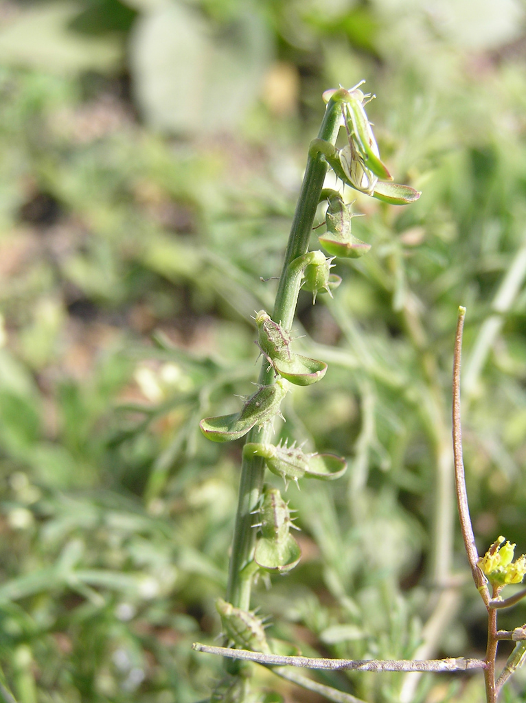 Hierba anual, híspida. Tallos de hasta 40 cm erectos. Hojas (1)2-pinnatisectas, de 2-6 x 1-3 cm, con los segmentos de segundo orden lineares, obtusos, frecuentemente mucronados. Flores dispuestas en racimos largos y ebracteados de 10-40 flores. Pedicelos de 1-1,5 mm en la antesis, recurvados y de hasta 3 mm en la fructificación. Sépalos erectos, de 4-5 mm, los laterales más o menos gibosos en la base. Pétalos de limbo obovado, de 7-9 mm, atenuados en una uña un poco más larga que éste. Androceo tetradínamo. Fruto en silícula, patente o reflejo, con dos artejos bien diferenciados; artejo valvar elipsoidal, bilocular, de 3-4 x 2-2,5 mm, con las valvas convexas, recorridas por tres nervios conspicuos, cubiertos de pelos cónicos, generalmente con tres semillas en cada lóculo, dehiscente; rostro de 4-6 x 3-4 mm, cocleariforme, con la concavidad hacia arriba, foliáceo y estéril. Semillas subglobosas, de 1-1,5 mm, de un pardo oscuro, a veces algo rojizas.