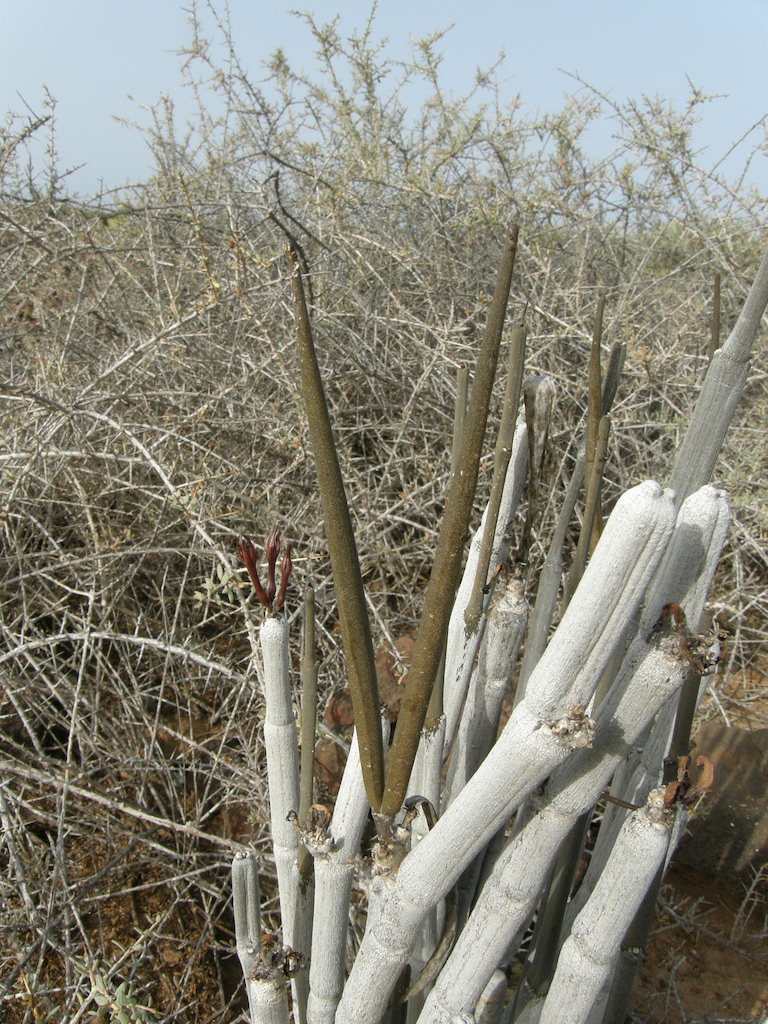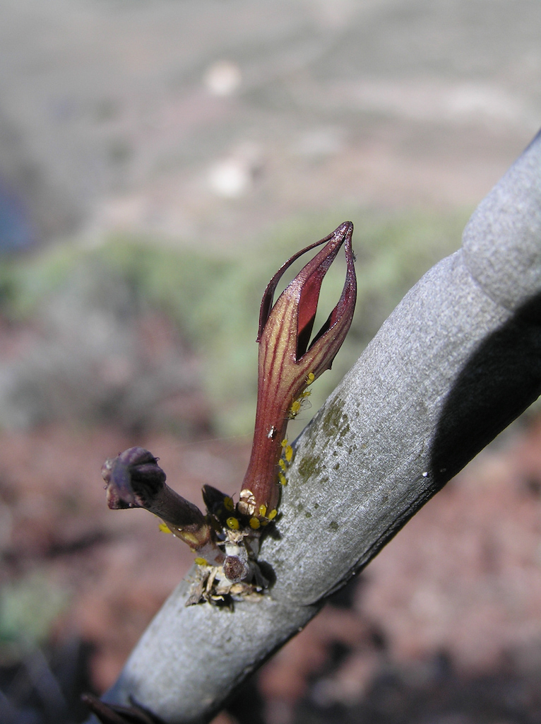 Planta suculenta, erecta, rastrera o ascendente, ramificada desde la base, que puede alcanzar los 75 cm de altura. Tallos carnosos, cilíndricos, segmentados, de color blanco grisáceo a gris marronáceo. Hojas linear-lanceoladas, simples, opuestas, de color marrón-rojizo y nerviación marcada, caedizas, que duran muy poco tiempo, desapareciendo los meses más secos, de 3-6 cm de largo. Inflorescencias situadas en los nudos de las articulaciones superiores de cada tallo, formadas por grupos de 2-8 flores, con pedúnculo marrón rojizo. Corola de color púrpura, tubular, de hasta 5 cm, con el tubo algo inflado en el tercio inferior, ensanchándose más arriba en forma de embudo, con cinco lóbulos en la parte apical unidos en la punta, formando pequeñas ventanitas, lóbulos que terminan por abrirse. Fruto en bifolículo; cada folículo fusiforme, de 10-13 cm de largo. Semillas marrones, planas, provistas de un vilano.