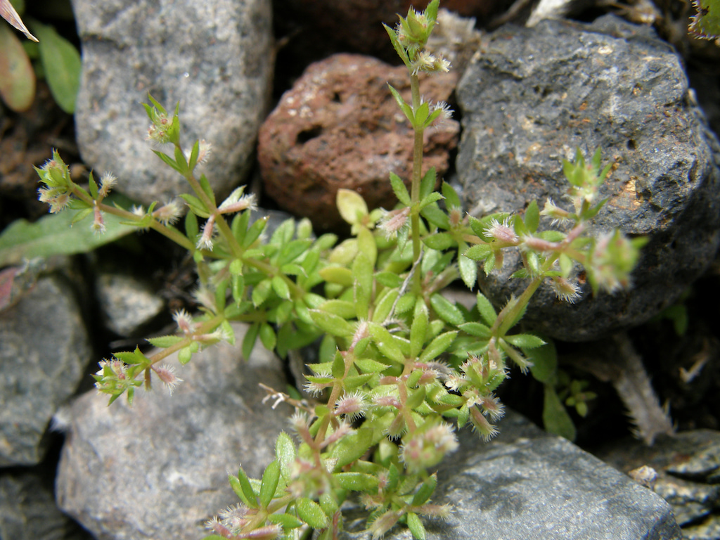 Hierba anual, multicaule, glabrescente o hirsuta, verde, más rara vez pardusca. Tallos de hasta 30 cm, ascendentes o postrados, simples o ramificados, con la mayoría de los nudos floríferos; entrenudos medios 1-4(6) veces mayores que las hojas, glabros o, menos frecuentemente, retrorso-escabriúsculos, con aculéolos de 0,1-0,25 mm, o bien con pelos de 0,15-0,45 mm en la parte superior y glabros en la inferior; nudos generalmente glabros. Hojas de 1,7-6(10) x 0,5-2(3,5) mm, sésiles, en verticilos de (2)3-6(7), patentes o erectas, rectas, oblanceoladas, lanceoladas o elípticas o, con menor frecuencia obovadas, agudas, con arista hasta de 0,3 mm, planas o a veces con el margen revoluto, con 1 nervio principal tenue, concoloras o algo discoloras, verdes, rara vez pardo-verdosas tras la desecación, glabras y con margen antrorso-escabriúsculo, o con pelos antrorsos hasta de 0,3 mm en haz, envés y margen; las basales en verticilos de 4-6, cortamente pecioladas y semejantes a las anteriores, a veces obtusas, secas o inexistentes durante la floración. Inflorescencia extendida casi por toda la longitud del tallo, más o menos cilíndrica, con eje glabro o peloso, y (1)2 flores axilares por nudo, o bien con una 1(2) flores y una cima geminada por nudo, ésta con pedúnculo generalmente menor que las brácteas, glabro o peloso. Brácteas foliáceas, las superiores generalmente (1)2-3(4) por nudo. Bractéolas inexistentes. Flores hermafroditas, tetrámeras; pedicelos de 0,3-0,5 mm, erecto-patentes, casi iguales al diámetro de la corola, los fructíferos de (0,1)0,4-1,5(2) x 0,15-0,3 mm, iguales o menores que las brácteas y los frutos, fuertemente reflexos en la madurez del fruto, glabros o, menos frecuentemente, pelosos, a veces con los pelos uncinulados. Corola de 0,4-0,65(1,1) mm de diámetro, con lóbulos erectos o más rara vez patentes, glabra o pelosa apicalmente, blanquecina, por lo general rosada en la parte superior, más rara vez verdosa; tubo de 0,05-0,15 mm; lóbulos de 0,2-0,45 mm, ovados o triangulares, más o menos agudos e incurvos. Estambres 4. Ovario de 0,65-1 mm, mayor que la corola, oblongo, cubierto heterogéneamente de pelos uncinados blancos; estilo hasta de 0,3 mm; estigmas globosos. Mericarpos de (0,8)1,1-1,7 mm, cilíndricos, más o menos curvos, negruzcos, lisos o diminutamente granulosos, cubiertos irregularmente de pelos de 0,15-0,5(0,6) mm, uncinados, blancos, más abundantes en la parte superior apical y dorsal, o bien glabrescentes.