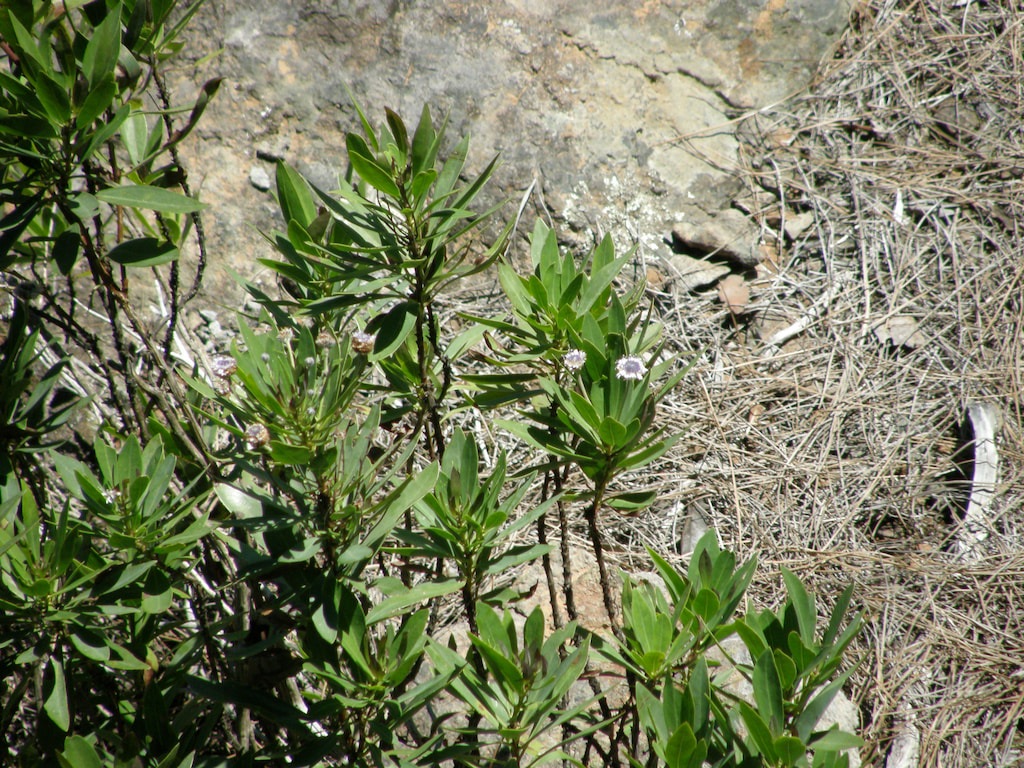 Nanofanerófito fruticoso, de hasta 40 cm. Ramas erectas, foliosas. Hojas lanceoladas u oblanceoladas, de 5-7 x 1,5 cm, enteras, de color verde oscuro, glabras, base cuneada y ápice obtuso a subagudo. Inflorescencia terminal, densa, compacta, con 4-6(-10) capítulos subglobosos de 1,5-2 cm de diámetro, en pedúnculos simples de 2-3(-5) cm de largo, blancos, vellosos, bracteados. Flores de color blanco y azul purpúreo las centrales.
