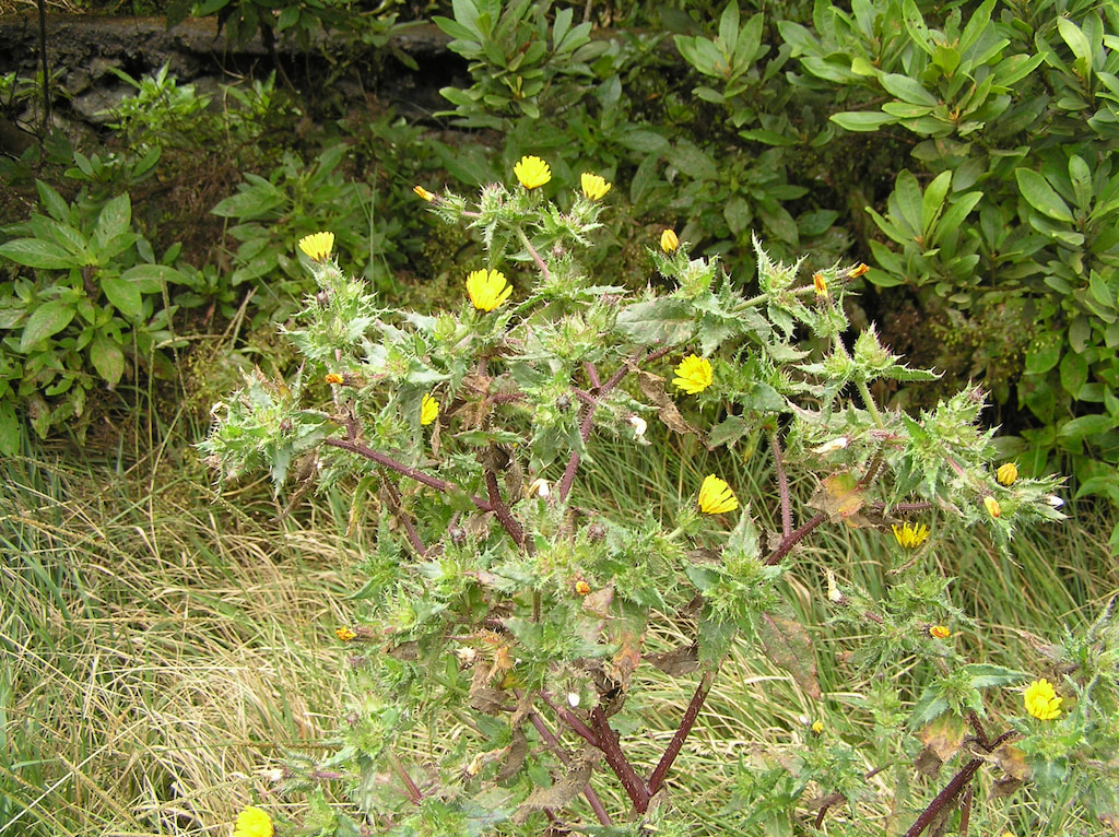 Hierba anual de hasta 150 cm, rara vez perennizante, densamente escábrida o espinosa, carente de roseta de hojas en la floración. Tallos erectos, ramificados en la mitad superior o cerca de la base, verdosos o rojizos, con acúleos espinosos hasta de 3,5 mm, generalmente con numerosas hojas bien desarrolladas. Hojas de oblanceoladas a panduriformes, enteras, dentadas o lobuladas, a veces runcinadas, con acúleos espinosos en su haz y en el margen hasta de 5 x 1 mm y setas gloquidiadas más pequeñas, sobre todo en los nervios del envés; las basales de hasta 30 x 10 cm, largamente pecioladas, oblanceoladas; las caulinares de hasta 15 x 4 cm, oblanceoladas o panduradas con pecíolo ancho y subamplexicaule. Capítulos pedunculados, rara vez sésiles o subsésiles, agrupados en una panícula subcorimbosa o espiciforme, rodeados por 5 hojas involucrales de 7-20 x 4-10 mm, cordiformes, agudas, hasta con 58 pares de espinas en el margen; pedúnculos de hasta 4 cm, cilíndricos, con setas gloquidiadas en toda su longitud. Involucro campanulado; brácteas dispuestas en 2 series, lanceoladas, desiguales, las externas de 1,5-6 x 0,5-1 mm, carentes de apéndice subapical, las internas, en número de 8, de 9-14 x 2,5-5 mm, escariosas en el margen, con el nervio medio provisto de setas gloquidiadas, con un apéndice subapical densamente setuloso de 2,5-8 mm, que generalmente sobrepasa a la bráctea en más de 3 mm, a veces sin apéndice. Receptáculo alveolado, con los alvéolos de margen poco desarrollado y entero, glabro. Corola de las flores externas de 10-12 mm, de un amarillo pálido; tubo de 3-5,5 mm, algo peloso en el ápice; limbo de 6,5-7,5(8) mm, viloso en la base. Anteras de 2-3 mm. Ramas estilares de 1-1,5 mm, negruzcas. Aquenios dimorfos, sin costillas bien diferenciadas; los más externos de 6-7 mm, adnatos al receptáculo, encerrados en las brácteas internas del involucro, con cuerpo seminífero de 2,5-3 x 1,5-3 mm, más o menos cónico, curvado, más o menos seríceo en el vientre, glabro en el dorso, blanquecino, atenuado en un pico ancho y poco diferenciado del cuerpo en su mitad inferior, fino y ondulado en la superior; los internos de 5,5-9 mm, con el cuerpo seminífero de 2,2-3 x 0,9-1 mm, ovoide o subcilíndrico, con escuámulas transversales anchas, glabro, pardo-rojizo, bruscamente contraído en el ápice, con el pico de (3)3,5-5(6) mm, fino, ondulado, blanquecino, que se quiebra por su base antes o durante la dispersión. Vilano formado por 19-22(25) pelos enteramente plumosos, soldados entre sí en la base, formando una corona íntimamente unida al pico del aquenio, blanco; en los aquenios externos de 2-3 mm, con los pelos muy desiguales, persistente o caedizo; en los internos de (5)6-7 mm, con los pelos casi iguales, caedizo.