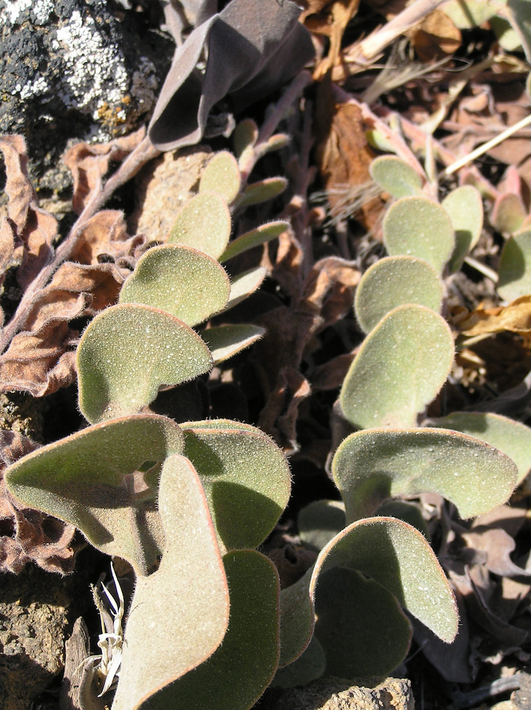 Planta acaule, pubescente. Hojas en roseta basal, de las que surgen varios tallos florales, sinuoso-lobuladas, pubescentes, con lóbulos anchamente reniformes, oblicuos y ondulados, subimbricados a bastante imbricados, solapándose en parte a modo de tejas, con el lóbulo terminal más grande, no mayor de 4-5 cm. Tallos florales con alas anchas y onduladas, desprovistos de hojas. Cáliz de las flores infundibuliforme, de color violáceo o azulado. Pétalos de color blanquecino.