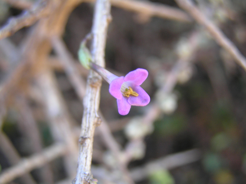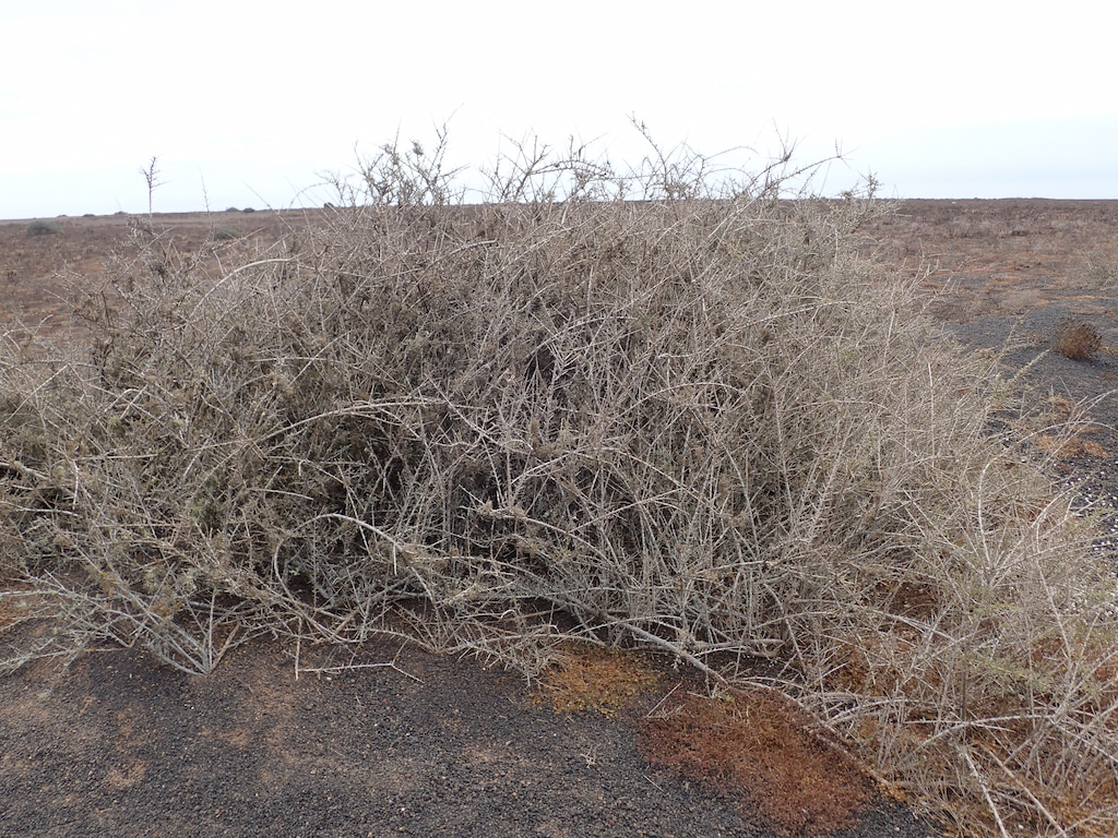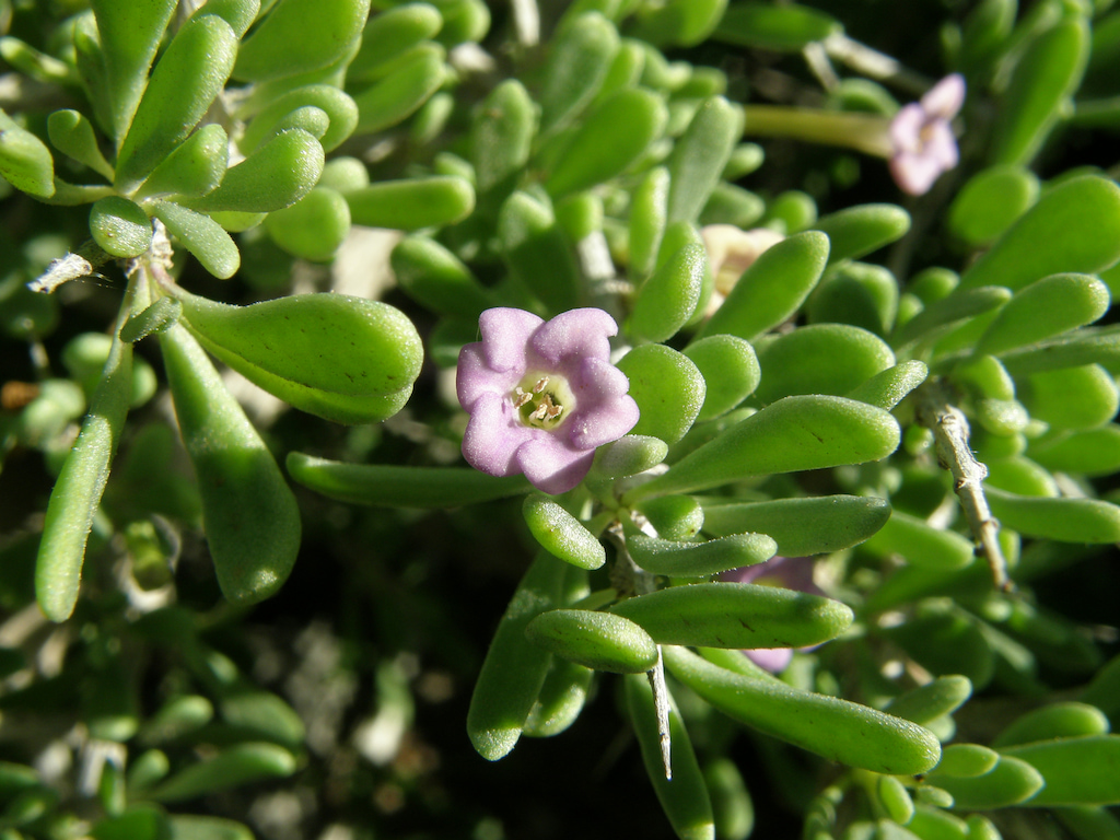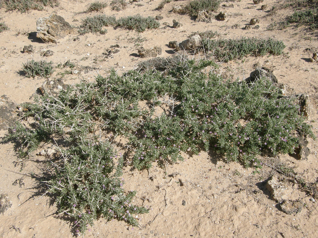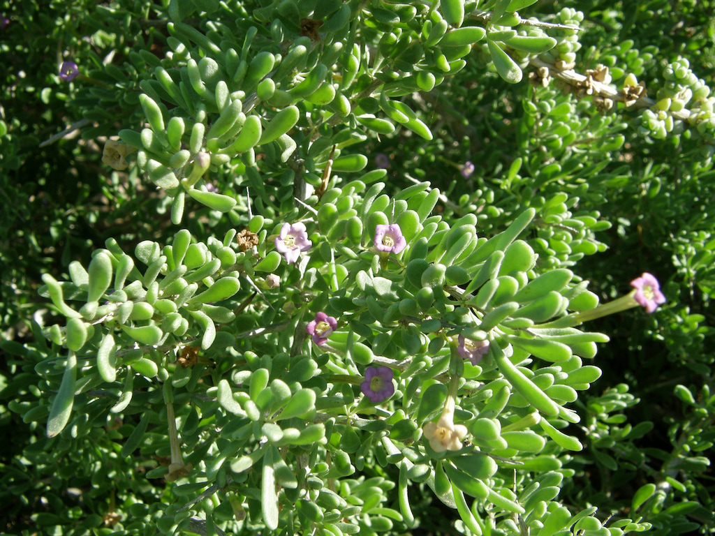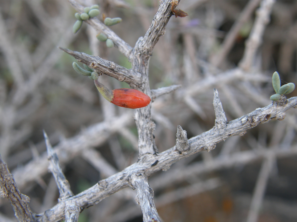 Arbusto glabro o cortamente glanduloso, al menos en las partes jóvenes. Tallos de hasta 2 m, muy ramificados; ramas muy intricadas, con fuertes espinas terminales. Hojas de 2-26 x 1-3(6) mm, alternas o en braquiblastos muy cortos formando fascículos hasta de 8, espatuladas, obovadas o elípticas, obtusas o subobtusas, glandulosas al menos cuando jóvenes, carnosas. Inflorescencia reducida a una sola flor, solitaria, axilar. Flores ligeramente zigomorfas, hermafroditas, ebracteadas, pediceladas; pedicelos de hasta 4 mm, esparcidamente glandulosos. Cáliz de 1,7-3 mm, campanulado, con 5 lóbulos más o menos iguales, a veces bilabiado en la fructificación, glanduloso; tubo de 1,5-2,5 mm, más largo que los lóbulos; lóbulos triangulares, obtusos, pubescente-glandulosos en su cara interna. Corola de 11-18 mm, infundibuliforme o hipocrateriforme, violeta, en general con 5 nervios; tubo de 9,5-13,5 mm, de 5-6 veces más largo que los lóbulos, subcilíndrico u obcónico, a veces con 5 ángulos; lóbulos de 1,5-2,5 x 1,5-2,5 mm, ligeramente distintos, dos ovados y tres más o menos suborbiculares, obtusos, ciliados. Estambres insertos en la mitad inferior del tubo de la corola, ligeramente desiguales, en general inclusos; filamentos de 4-6,5(8,5) mm, más largos que las anteras, glabros; anteras de 0,7-1 x 0,4-0,8 mm, ovoides. Estilo de 7,5-14 mm, incluso o exerto; estigma de 0,4- 0,6 mm de anchura, en general capitado. Fruto de 3-7(9) mm, más o menos esférico, rojo o anaranjado, virando a negruzco o negro-rojizo en la desecación. Semillas de 2-3 x (1,4)2-2,7 mm, reniformes o de sección ovada, elíptica o redondeada.