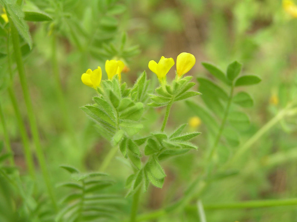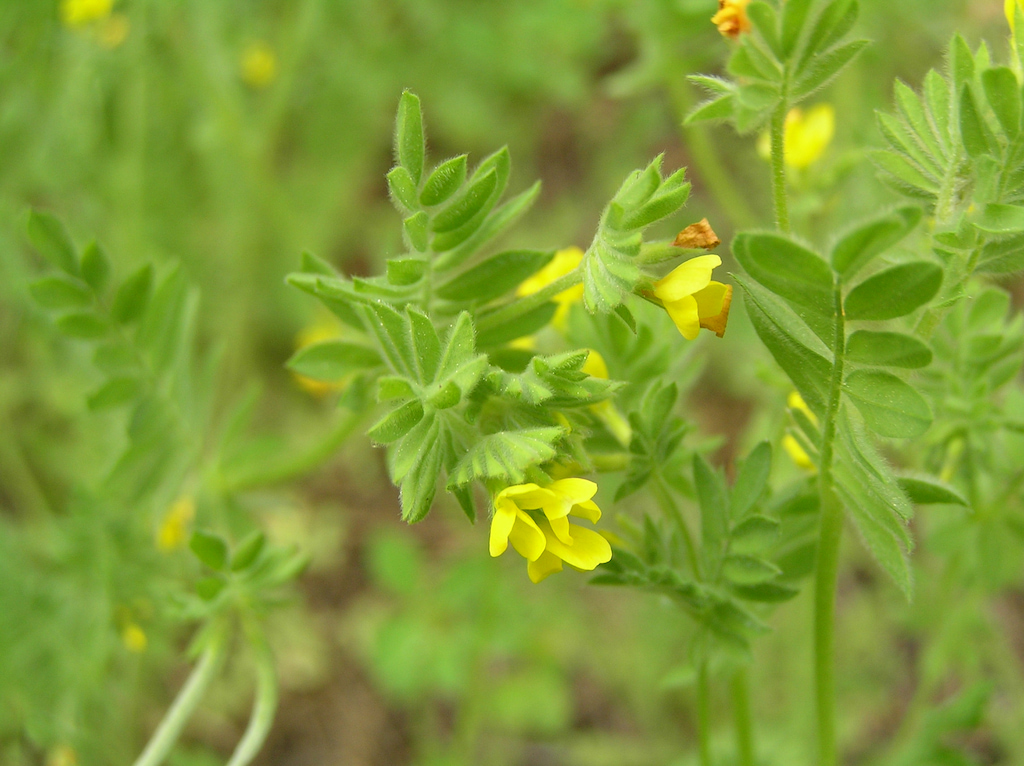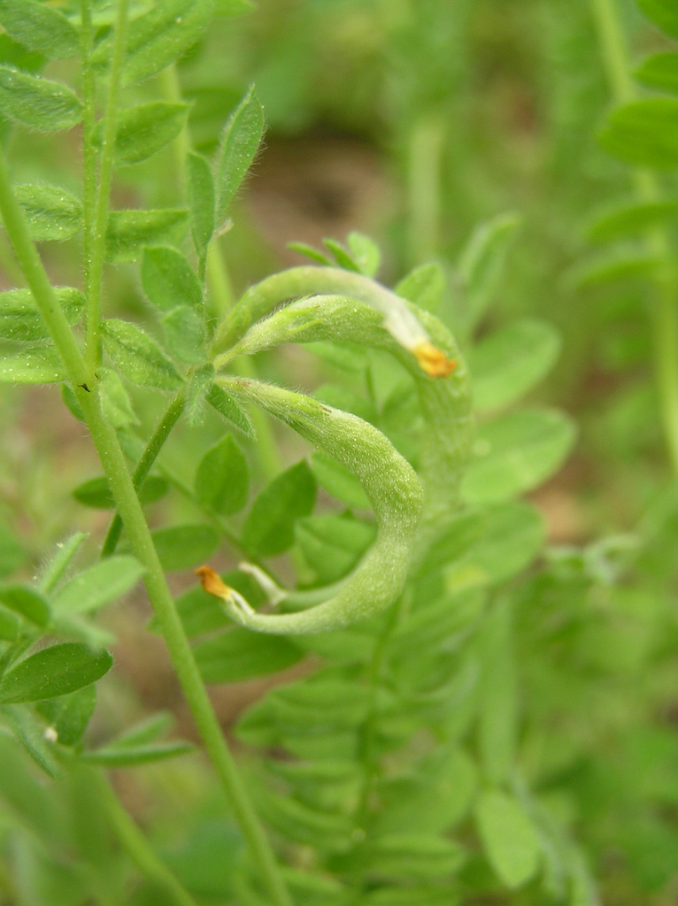 Hierba erecta, decumbente o ascendente. Tallos de hasta 75 cm, con indumento viloso laxamente dispuesto. Hojas alternas, de hasta 12 cm, pecioladas o sentadas, imparipinnadas, con 8-18 pares de folíolos; estípulas libres entre sí, soldadas a la base del pecíolo, de menos de 1 mm, triangulares, con el ápice frecuentemente purpúreo; pecíolo de 0,5-1,5 cm; folíolos de 2-8(18) x 1,5-4(6) mm, peciolulados, ovados o elípticos, mucronados, con el haz y envés densamente vilosos. Inflorescencia axilar, con 1-5 flores; pedúnculo de 5-35 mm, con frecuencia más largo que la hoja correspondiente; bráctea foliácea, que sobrepasa con frecuencia a las flores, imparipinnada, con 3-5 pares de folíolos; flores subsentadas o con pedicelo de menos de 1 mm, rodeadas por bractéolas pequeñas, dentadas, con el ápice ocráceo. Cáliz subcilíndrico, bilabiado, de (3)3,5-5,1 mm, viloso; tubo de longitud casi el doble que la de los labios; labio superior bífido, algo más corto que el inferior, con dientes de c. 1 mm, linear-lanceolados; labio inferior con dientes de 1-1,5(2) mm, linear-lanceolados. Corola glabra, amarilla, con pétalos unguiculados; estandarte de 5-7 x 2,3-3 mm, obovado, truncado y mucronado en el ápice, atenuado en la base, con uña de 1,3-2,3 mm; alas de 4,5-6 x 1,5-2,2 mm, con aurícula de c. 0,5 mm y uña de 1,2-1,8 mm; quilla de 3-3,5 mm, que sobrepasa la mitad de las alas, oblonga, con uña de 2-2,3 mm. Androceo diadelfo; anteras de 0,2-0,3 x 0,15-0,25 mm. Ovario glabro o peloso, hasta con 12 rudimentos seminales. Fruto en lomento, de 18-42 x 1,5-3,8 mm, estipitado, lateralmente aplanado, no contraído entre las semillas, recurvado, con 2-11 tabiques transversales; podocarpo casi de la longitud del cáliz; pico de 3-15 mm, ensiforme, recurvado, de ordinario con el estilo presente en la madurez. Semillas reniformes, lisas, de 1,7-1,8 x (2,4)3-3,3 mm, pardas o amarillento-rojizas.