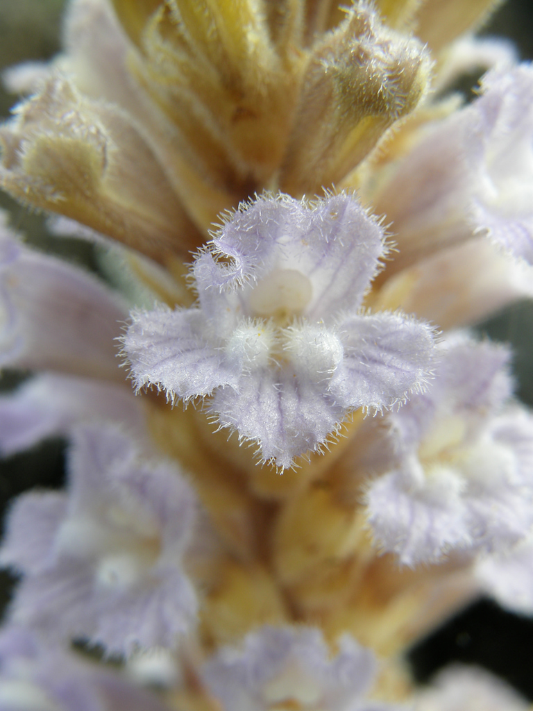 Planta parásita (casi siempre de Launaea arborescens), glandular-pubescente. Tallo de color marfil, parcial o totalmente bronceado, generalmente robusto. Inflorescencia variable: larga, multiflora y densa en la parte superior, o corta, laxa y con pocas flores. Brácteas florales lanceoladas, agudas. Flores erectas o erecto-patentes. Cáliz 7-11,2 mm, con 4-5 dientes, estrechamente triangulares (el quinto más corto y a menudo más anchamente triangular), agudos y mayores que el tubo. Corola tubular-infundibuliforme, con tubo largo de sección más o menos redondeada, de color azul pálido o muy pálido; labio superior con lóbulos patentes, redondeados y más o menos separados; labio inferior con lóbulos espatulados-obovados, erosos, más o menos apiculados. Fruto en cápsula, ovoideo-elipsoidal, comprimida lateralmente, mínimamente apiculada. Semillas reticuladas, grisáceas, algo globosas, de c. 0,3 mm de largo.