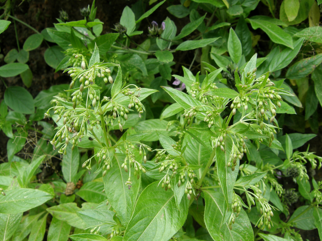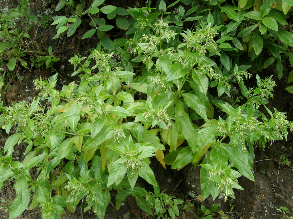 Planta leñosa, subarbustiva, que puede alcanzar el metro de altura, erecta y muy ramificada. Hojas opuestas o en verticilos de 3-4, de 8-15 cm de largo, lanceoladas, cortamente pecioladas, con margen entero, de color verde lustroso en el haz y verde más claro en el envés, pubescentes, sobre todo en los bordes y débilmente pegajosas. Inflorescencias terminales o subterminales, en panículas laxas y péndulas, de 8-30 cm de altura, generalmente hermafroditas. Flores poco llamativas, de color verdoso blanquecino. Corola de 2-5 mm de ancho, con 4-5 pétalos. Pedicelos fructíferos péndulos. Fruto en cápsula, de 2,5-4 mm de longitud, glabro, de color negruzco, dividida en dos secciones indehiscentes.