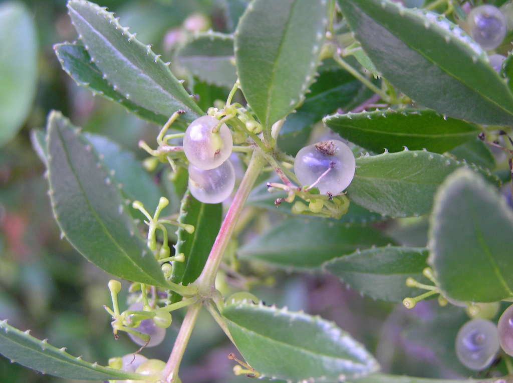 Arbusto trepador de base leñosa o enredadera, cuyas ramas pueden alcanzar varios metros de largo y son estriadas y provistas de pequeños dientes retrorsos. Hojas de color verde oscuro, simples, rígidas, pecioladas, verticiladas en grupos de 2-6, de 2-3 cm de longitud, aunque pueden alcanzar 8 cm y son más largamente pecioladas en las plantas que crecen en zonas de laurisilva, elípticas a ovadas, con el margen, nervio principal del envés y pecíolo muy espinoso, con dientes rígidos y ásperos. Flores dispuestas en inflorescencias axilares y terminales. Flores pequeñas, de 3-5 mm de ancho, pediceladas, hermafroditas, sin cáliz. Corola rotácea, con tubo muy corto y lóbulos triangular lanceolados, patentes, de color amarillo verdoso. Estambres 5, exertos. Estilo bífido. Fruto en baya globosa, de color blanco translúcido, o morado que se torna negro al madurar, de 4-6 mm. Semillas rugosas, casi negras.