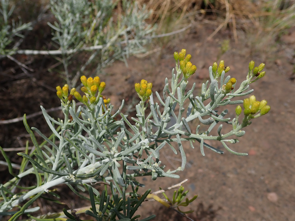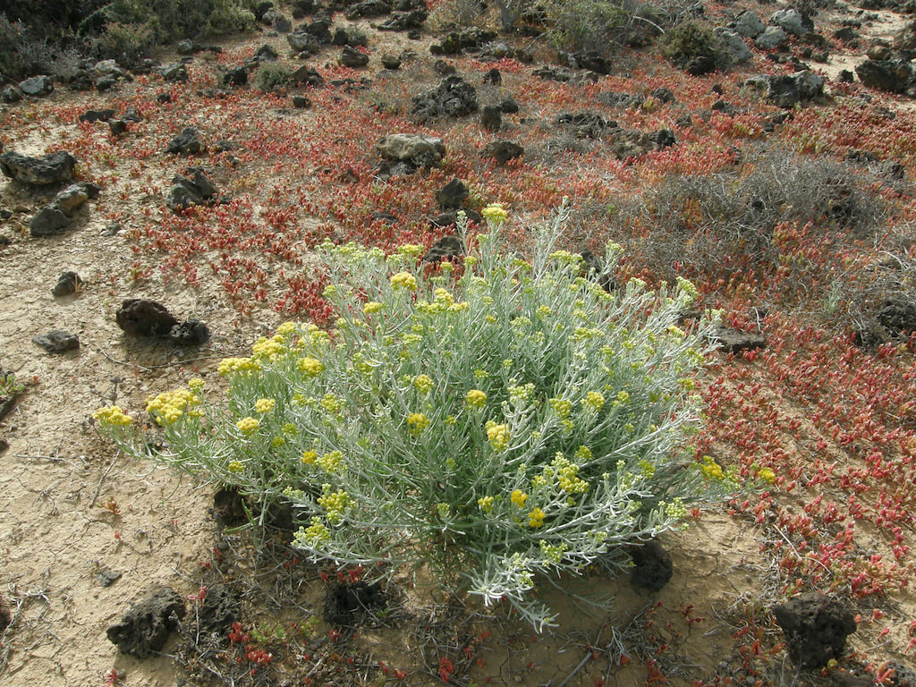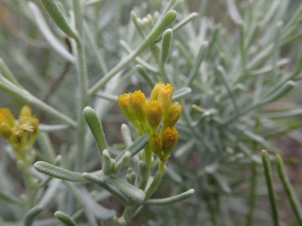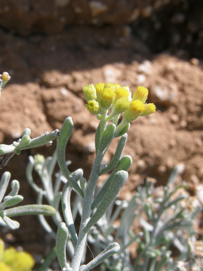 Subarbusto que puede alcanzar el metro de altura. Tallos y ramas con coloración blanquecino-serícea debido a estar recubierto por un indumento fino de color blanco. Hojas simples, planas, obtusas, algo carnosas, lineares, de 3-5 cm de largo, blanco-grisáceas, al estar cubiertas de un indumento similar al de los tallos. Inflorescencias terminales, cortas, densas, con capítulos de unos 4-6 mm de diámetro. Brácteas involucrales escariosas, lanceoladas, las externas, pequeñas y triangulares, amarillentas, dispuestas en varias filas. Capítulos formados solo por flósculos, de color amarillo, apenas más largos que las brácteas involucrales. Cipselas con un arco de escamas y una fila de setas ásperas.