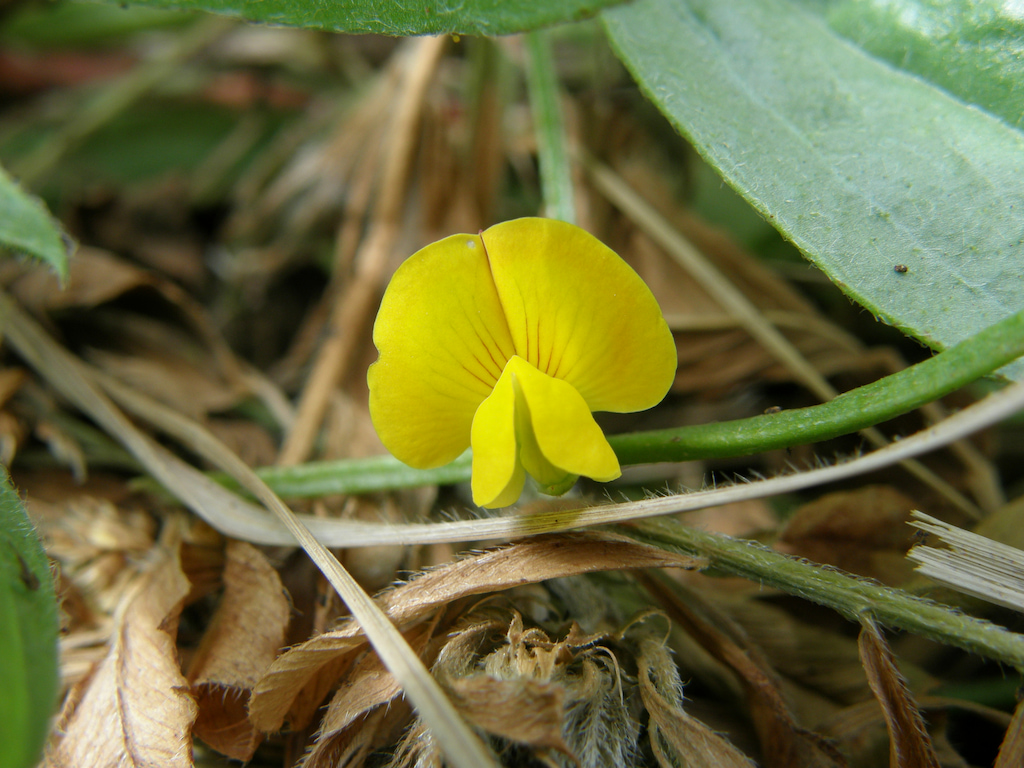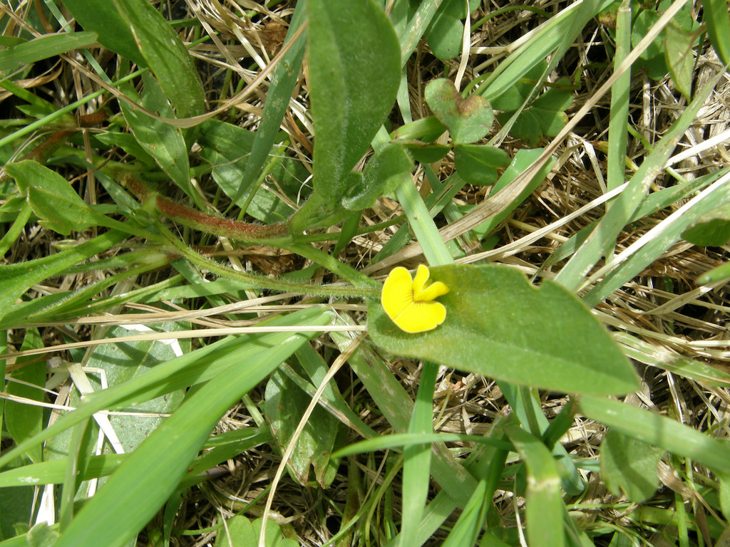 Hierba de hasta 40 cm, generalmente poco ramificada, densamente vilosa en tallos, hojas jóvenes y pedúnculos florales. Tallos erectos o postrados, generalmente ramificados en la base. Hojas alternas, simples, unifolioladas, de (20)55-125 mm; estípulas con la parte libre de 10-22 x 1,5-3 mm, membranácea, con el nervio medio verdoso; pecíolo aplanado, casi tan largo como la lámina; lámina de (6)15-35 mm de anchura, oblanceolada o elíptica, aguda, mucronada, atenuada hacia el pecíolo, con 5-7 nervios principales más o menos paralelos, más densamente pelosa en los márgenes y nervios del envés. Inflorescencias axilares, pedunculadas, con 1(3) flores; pedúnculo de (20)55-250 mm, generalmente mucho más largo que la hoja axilante, en la fructificación; bractéolas de 0,6-0,8 mm, membranáceas, con el ápice frecuentemente purpúreo. Flores con pedicelo de 2,5-3(4) mm e hipanto. Cáliz más o menos campanulado, bilabiado, de (5)6-8 mm, más o menos viloso; tubo de 3-4 mm, algo más corto que los labios; labio superior de 3-5 mm, bipartido, con dientes de 2,5-4 x 1-1,5 mm; labio inferior tripartido, con dientes de 3-5 x 1,7-2 mm. Corola de las primeras flores purpúrea, la de las otras amarilla, con el dorso del estandarte rojizo en el borde y una mancha cordiforme blanquecina en el vientre; estandarte de (8)11-14 x (8)11-14 mm, suborbicular, emarginado, con uña de 4-5 mm, incluida en el cáliz; alas de (7,5)9-10,5 x 5-6 mm, obovadas, con uña de 3-4 mm; quilla de (7)8-9 x 2,8-3,2 mm, curvada en ángulo obtuso, falcada, con pico coriáceo y uñas de 3-3,5 mm. Androceo diadelfo, con estambres con anteras de 0,2-0,5 mm. Ovario con 7-8 rudimentos seminales; estilo de 5-6 mm; estigma elíptico, extrorso. Fruto de 5-7 mm de anchura, lomentáceo, más o menos toruloso, muy contraído entre las semillas, que se fragmenta muy tardíamente, arrollado en varias espiras concéntricas, con c. 11 costillas longitudinales, generalmente todas cubiertas de excrecencias capitadas o flabeladas, rara vez con las costillas solo finamente tuberculadas, con 5-8 semillas. Semillas de 2-2,5(3) x (3)3,5-4,5 mm, reniformes, amarillas, finamente rugosas.