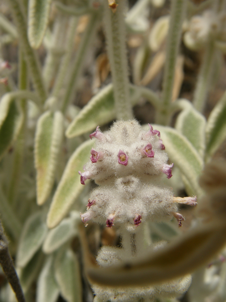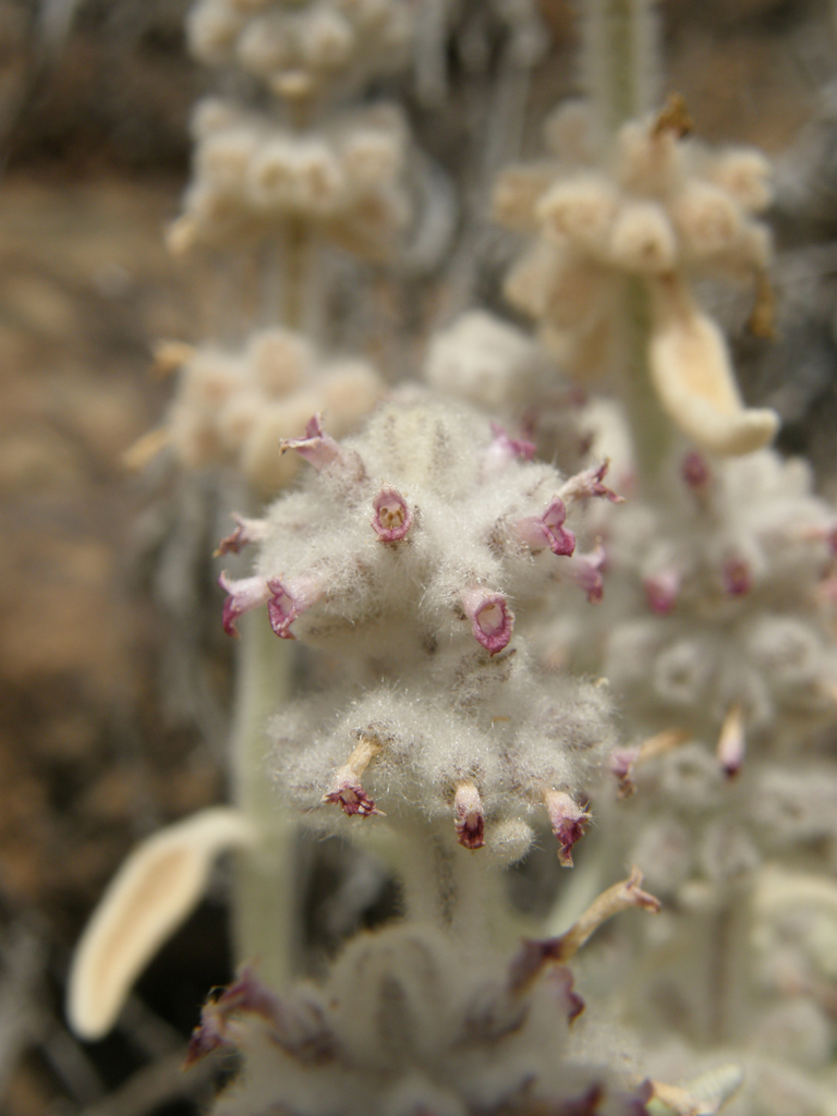 Arbusto erecto de hasta 70 cm de altura, ramificado, con tallo y ramas leñosos; ramitas cuadrangulares y de color marrón pálido densamente cubiertas de pelos cortos, finos, sedosos y blanquecinos. Hojas opuestas, pecíolos de hasta 2 cm de largo, hojas superiores casi sésiles; lámina triangular-subcordada con base ligeramente incurvada y margen crenado, las inferiores con lámina de hasta 5 cm de largo y 2 cm de ancho, ligeramente plegadas, con nervios poco visibles; hojas superiores casi lanceoladas, algo recurvadas, muy separadas (hasta 10 cm) del par inferior más cercano; hojas amarillentas en el haz y blancas y sedosas en el envés. Inflorescencia de hasta 15 cm de largo, erecta, verticilada, con 15 a 18 flores por sección verticilada, y hojas muy reducidas, casi ocultas, lanceoladas. Flores violáceas, con cáliz tubular, densamente pubescente, de hasta 7 mm de largo, regularmente dentado de forma triangular; pétalos recurvados, el labio inferior de forma sub-triangular, estambres no protuberantes. Semillas aplanadas, más o menos triangulares en forma, violáceas.