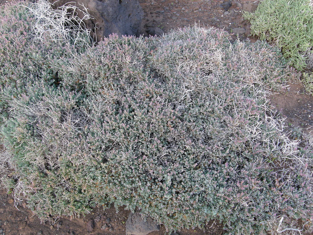 Arbusto de hasta 80 cm de altura, más o menos pubescente en los ápices de las ramas. Ramas principales de 2-3 mm de ancho, con ramas secundarias generalmente recurvadas de 1-2,5 mm, de donde salen las ramas de renuevo. Estas últimas con colores verde pálidos o completamente púrpuras, de 0,5-1,5 mm de ancho. Hojas alternas, sésiles, de lineares a oblongas, suculentas y cilíndricas, con ápice de obtuso a agudo, mucronado, de 5-12(14) x 0,5-2(2,5) mm, color glauco, en ocasiones con moteado o incluso toda la hoja de color rojo. Inflorescencias terminales espiciformes, usualmente ramificadas, de 2-10 cm de longitud. Brácteas como las hojas, pero sucesivamente más cortas, de 4-7 x 0,8-1,4 mm, normalmente recurvadas hacia el ápice, siempre más largas que las flores. Bractéolas escariosas, de oblongas a lanceoladas, de 0,5-1 x 0,2-0,7 mm, con margen entero o erosodentado. Flores sésiles, casi siempre solitarias, de 1,2-2,2 x 1-3 mm de tamaño, por excepción con 1(2) flores laterales. Tépalos 5, fusionados por la mitad, con los lóbulos libres incurvados, suculentos, de 0,6-1,5 mm largo, con márgenes membranosos y ápices cuculados persistentes, acrescentes. Estambres 5, filamentos acintados, de unos 2 mm de largo, insertos individualmente en la parte inferior del tépalo, sobrepasando finalmente los mismos. Anteras dorsifijas, de 0,5-1 x 0,5-1 mm., presentando un moteado marrón al madurar. Ovario ovoide o piriforme, de 0,7-1,7 mm, estigmas (2)3(4), subulados, papilosos, de 0,3-0,8 mm largo. Semillas horizontales, generalmente en forma de gota, con pico, de 1,3 x 1 mm; testa negra brillante.